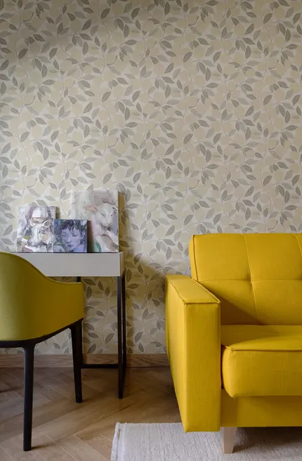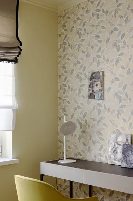 Спальни компактны, но выразительны. Акцент сделан на оформление стен — яркие принты обоев и цветные потолки. Искусство подобрано с учетом характера хозяйки и ее дочерей. Хозяйка — хореограф, и ее творческая натура отражена в картине Андрея Бурьяка, размещенной в спальне. В сочетании с обоями она рассказывает целую историю.